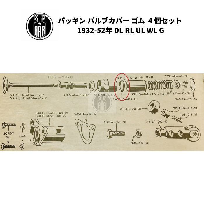 パッキン バルブカバー ゴム 4 個セット ハーレー 1932-52年 DL RL UL WL G
