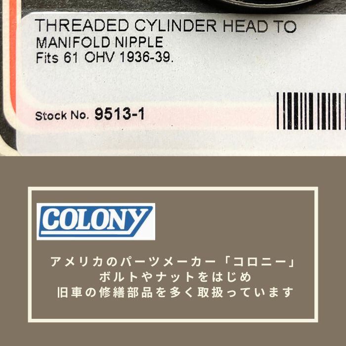 9513-1 colony コロニー シリンダーヘッド トゥー マニホールド ニップル ハーレーダビッドソン