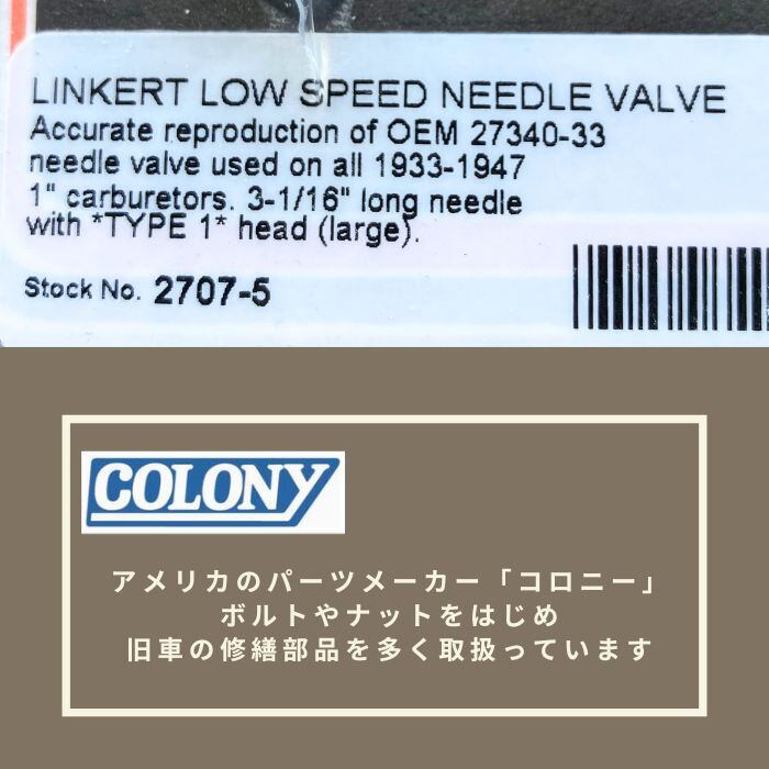 2707-5 コロニー colony リンカート ロー スピード ニードル バルブ ハーレーダビッドソン 1933-47年 1インチ キャブレーター
