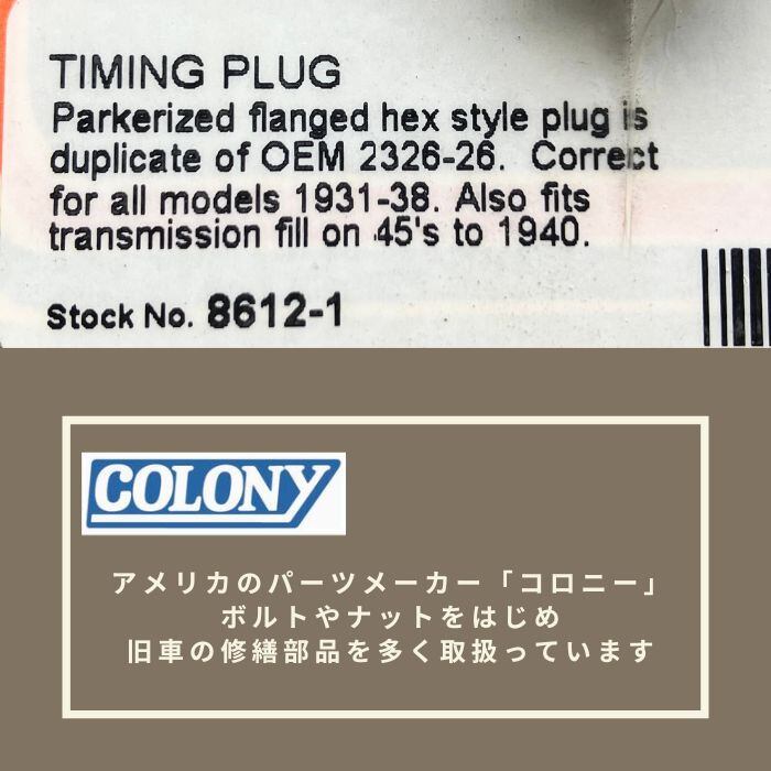 8612-1 Colony コロニー タイミング プラグ パーカーライズド ハーレーダビッドソン 1931-38年 全モデル TIMING PLUG PARKERIZED